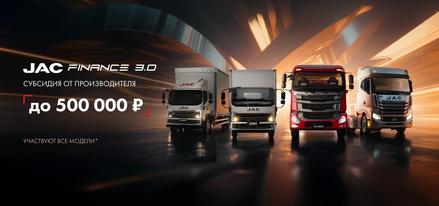 Покупка грузовика JAC по программе JAC Finance 3.0 позволит вам обновить или нарастить автопарк вашего предприятия за короткий срок. Больше информации представлено на странице программы.